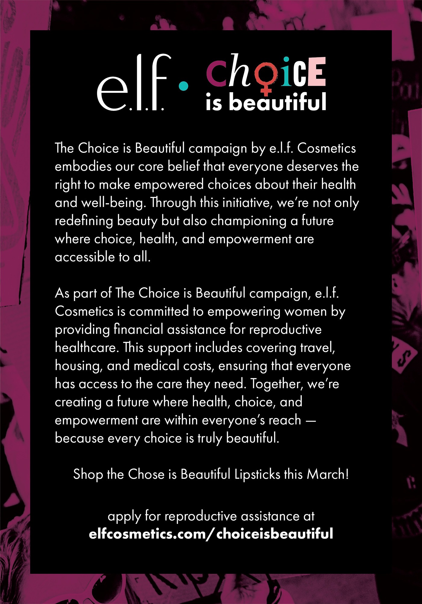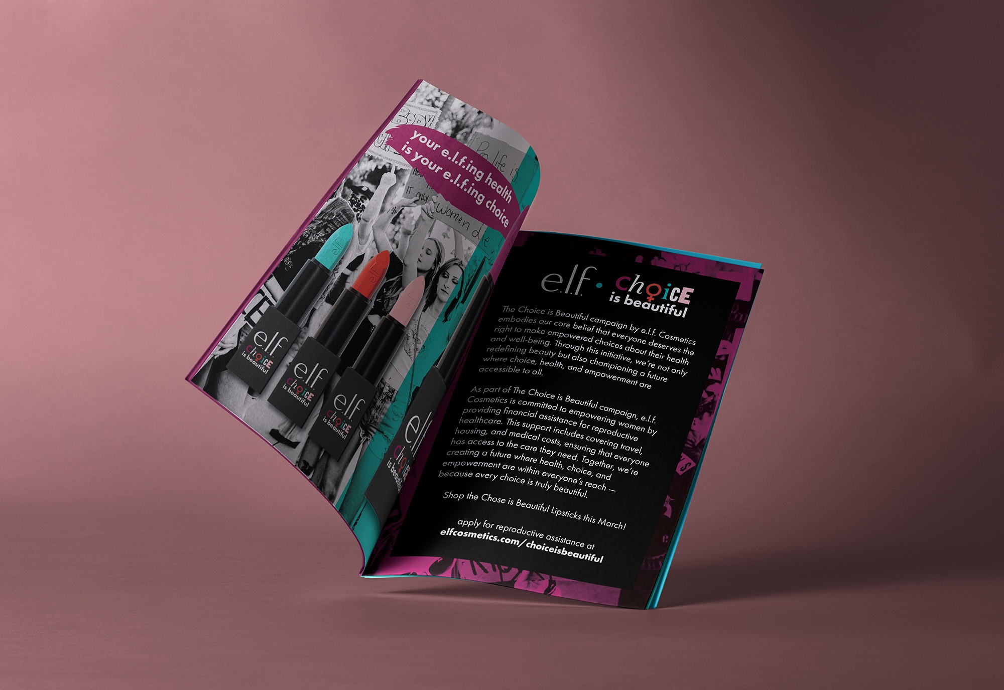 For one of my Graphic Design classes, we were tasked with designing a Corporate Responsibility Campaign for a brand of our choice. I chose e.l.f. cosmetics and focused their campaign on providing financial assistance to women seeking reproductive healthcare. I learned how to develop a consistent advertising campaign for multiple different environments such as social media, outdoor advertising, and web advertisments.